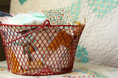 A simple and easy way to get started in hand piecing is to cut a bunch of squares, that are the same size, from your scraps or stash. Keep these in a cute container of some sort along with a small acrylic ruler, mechanical pencil, needle and thread. I like hand quilting thread. It’s stronger and I really want the hand projects I put so much time into to last. Now you will always have some hand piecing ready to go and before you know it you’ll have a quilt. I keep a wire basket full of 2.5 inch squares with a small acrylic ruler and mechanical pencil (for it’s sharp tip) together so that when the need to keep my hands busy arises I can whip up four patches or nine patches in a jiff. You may want to include a small pair of scissors and maybe even a thimble. I don’t use a thimble. Sometimes I use a band-aid. I don’t always use scissors. Sometimes I use my teeth. (Please don’t tell my mom…..or my kids). You can also include pins in your little kit. They are helpful, when seams get bulky, to hold everything in place.