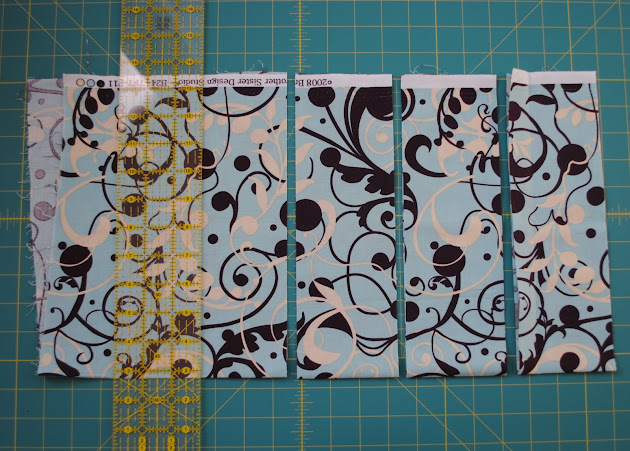 From the remaining piece cut one 3″ x 20/22″ strip and one 6″ x 20/22″ strips. Any remaining fabric can be added to the scrap pile.
