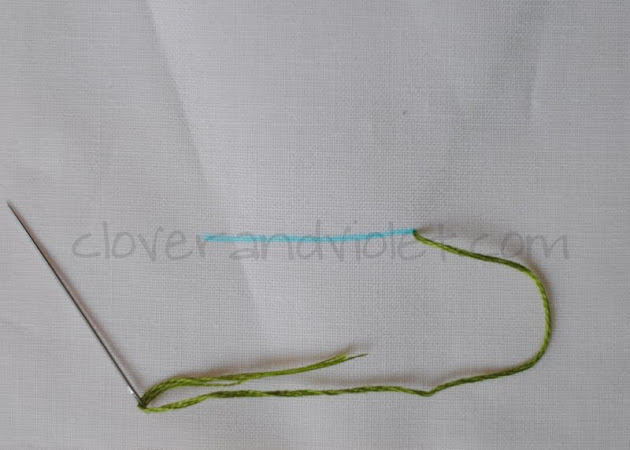 The Coral Stitch can be used as either an outline stitch or a filling stitch. It is generally worked right to left {I actually took my photos working it left to right…so they’ve all been flipped…sorry!}. When working the stitch, decide how many knots to place along the length of the design, then base the stitch length on that.