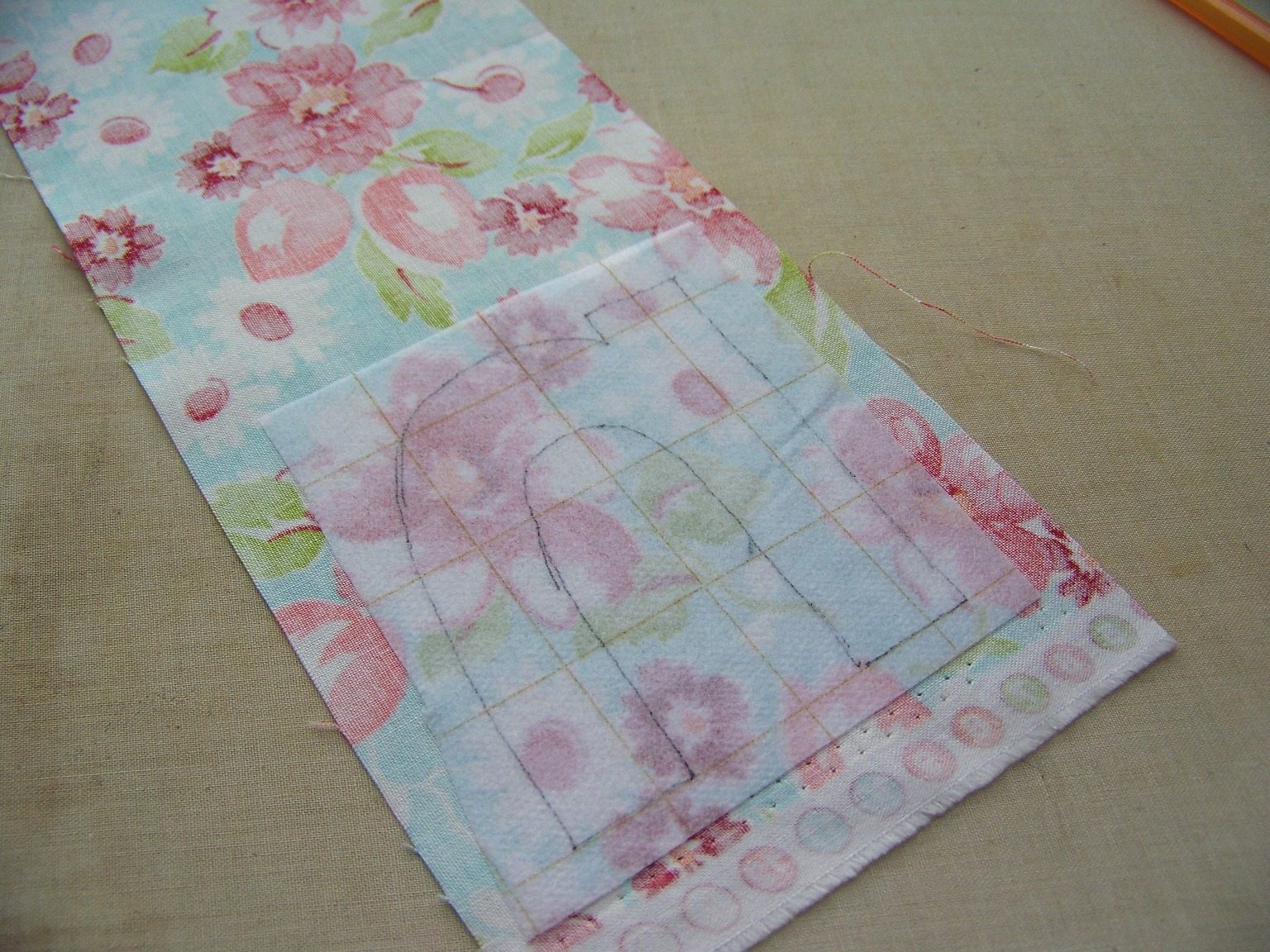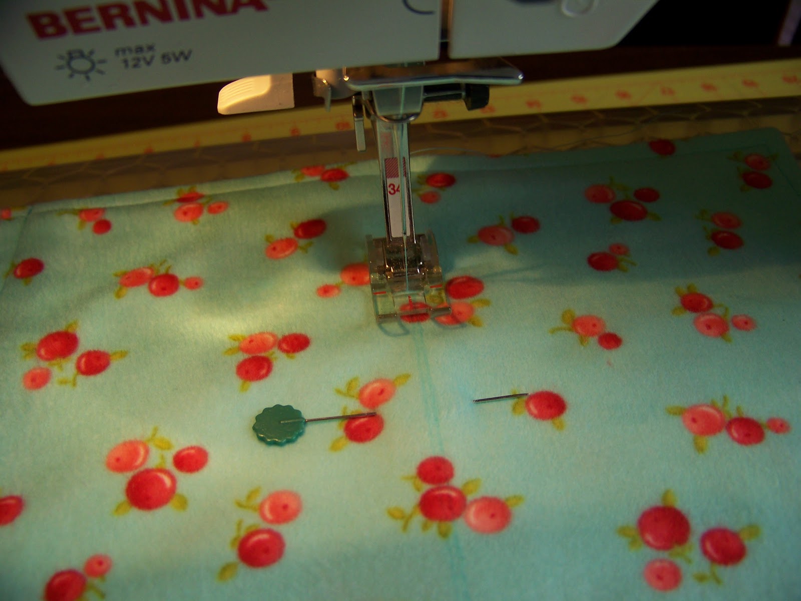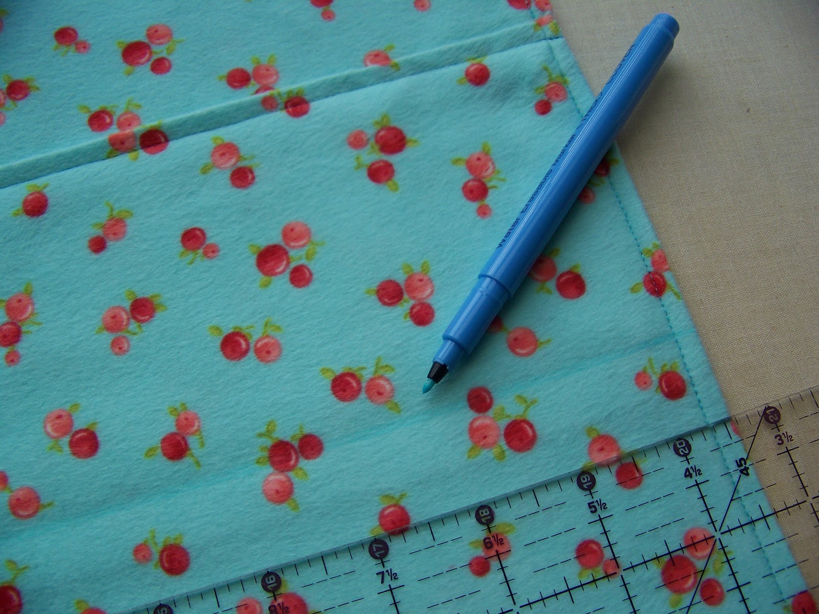 Using the measurement you just took, mark the other side of the burp cloth with a disappearing ink pen. (My line is kind of hard to see in this picture, but the marker is pointing to it.)  Your lines should be the same distance from both outer edges. Pin along the line to keep things in place.