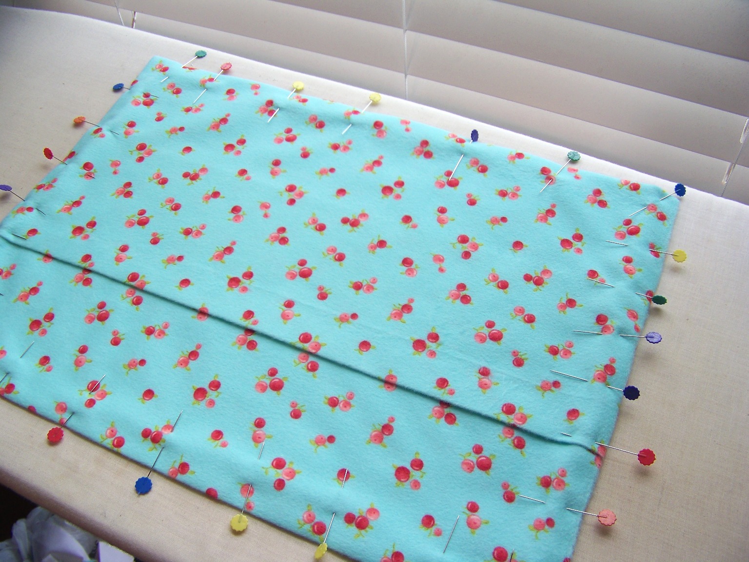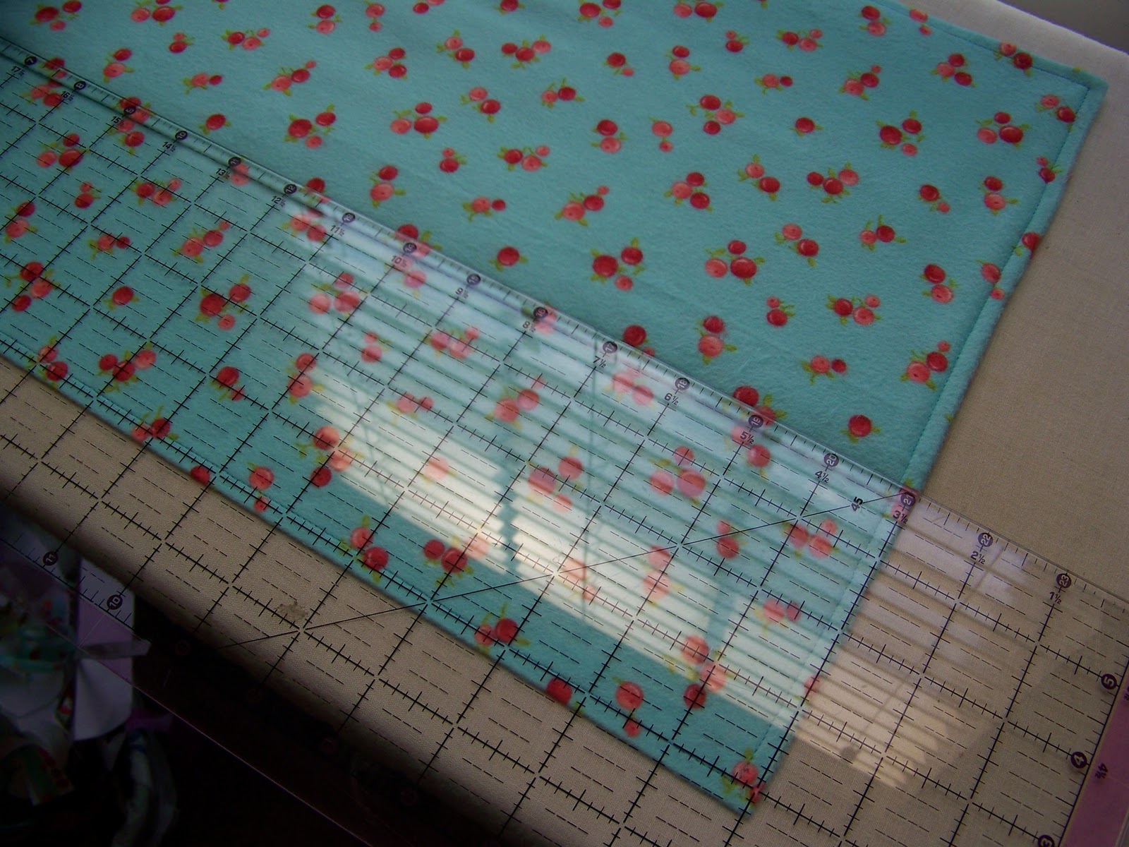Now, place the flannel wrong side down and fold the pinned edge up 8 inches. (Right sides will be together.) Use your ruler to check the length.