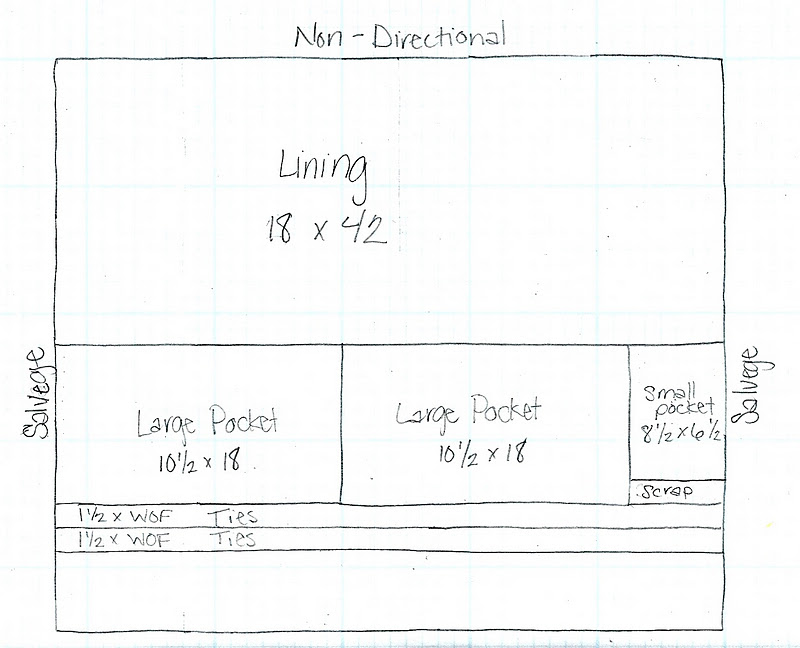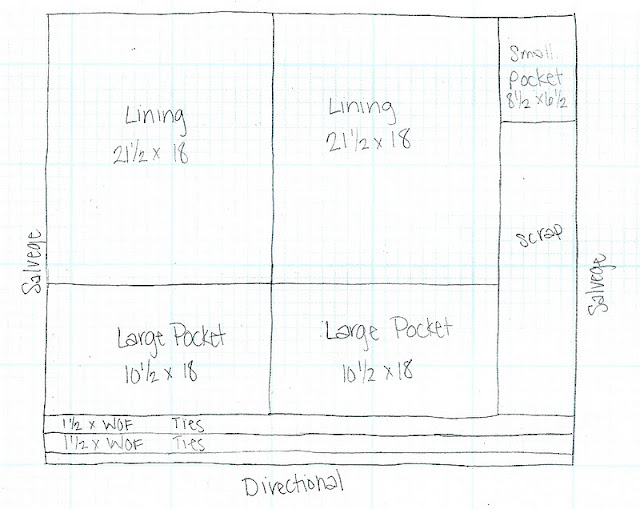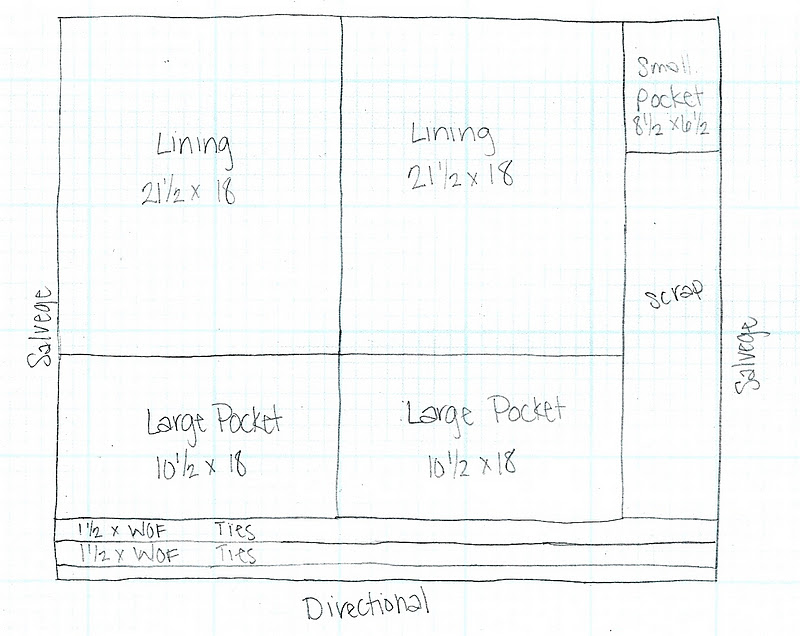 Since we had a week off {sorry!}, today we’ll be cutting out the lining, preparing the pockets, and Wednesday we’ll be making the bag handles and ties. Next week we’ll finish the embroidery pocket and assemble the bag. {Also, I apologize for the photo quality, I took these pictures at night and haven’t had a chance to retake them! Maybe someday….}