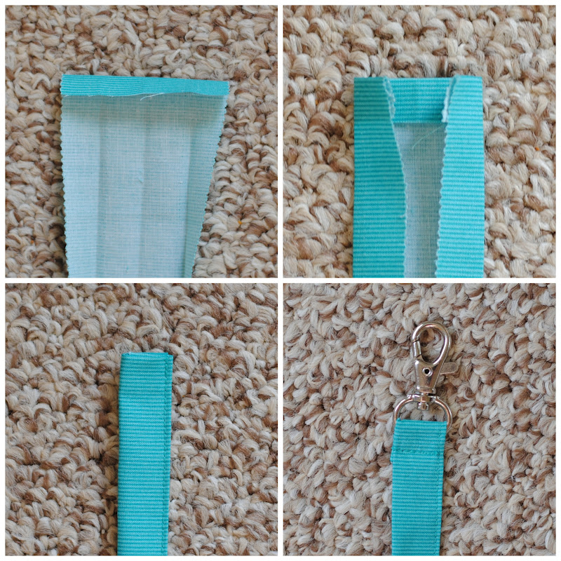 Then open and fold the raw edges toward the center, wrong sides together, press. Open handle and fold 1/4″ of one short edge down. Refold the handle piece along pressed lines. Stitch along the open edge. Feed the short folded edge through the swivel clip, stitch in place.