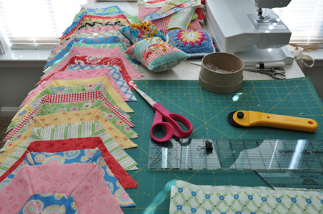 There is a lot of sewing and cutting and pressing but I love this quilt. It is so bright and cheery!! I am excited to see it finished and bound. If you want to see this same quilt made and almost finished go here, Amy has made it and it is gorgeous, she’s really fast!! We both wanted to make this quilt and have done sort of a quilt-a-long, more like, we are working on the same quilt but at our own pace. We are thinking about another quilt-a-long and I think it is a fun way to make a quilt and be encouraged along the way. We will let you know as soon as we decide on a quilt and when we plan to begin and maybe you would like to join us, no pressure!!
