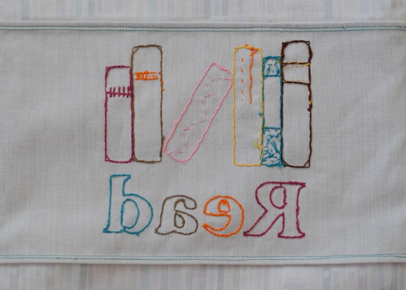 Here’s a look at the inside of a french seam.  I’ve also taken an extra step to top stitch the seam, which is useful using a french seam for a flat piece {like the embroidered “books” panel on the book bag}.  You can see an example of the flat, top stitched seam and the corner seams on the final image in the above collage.