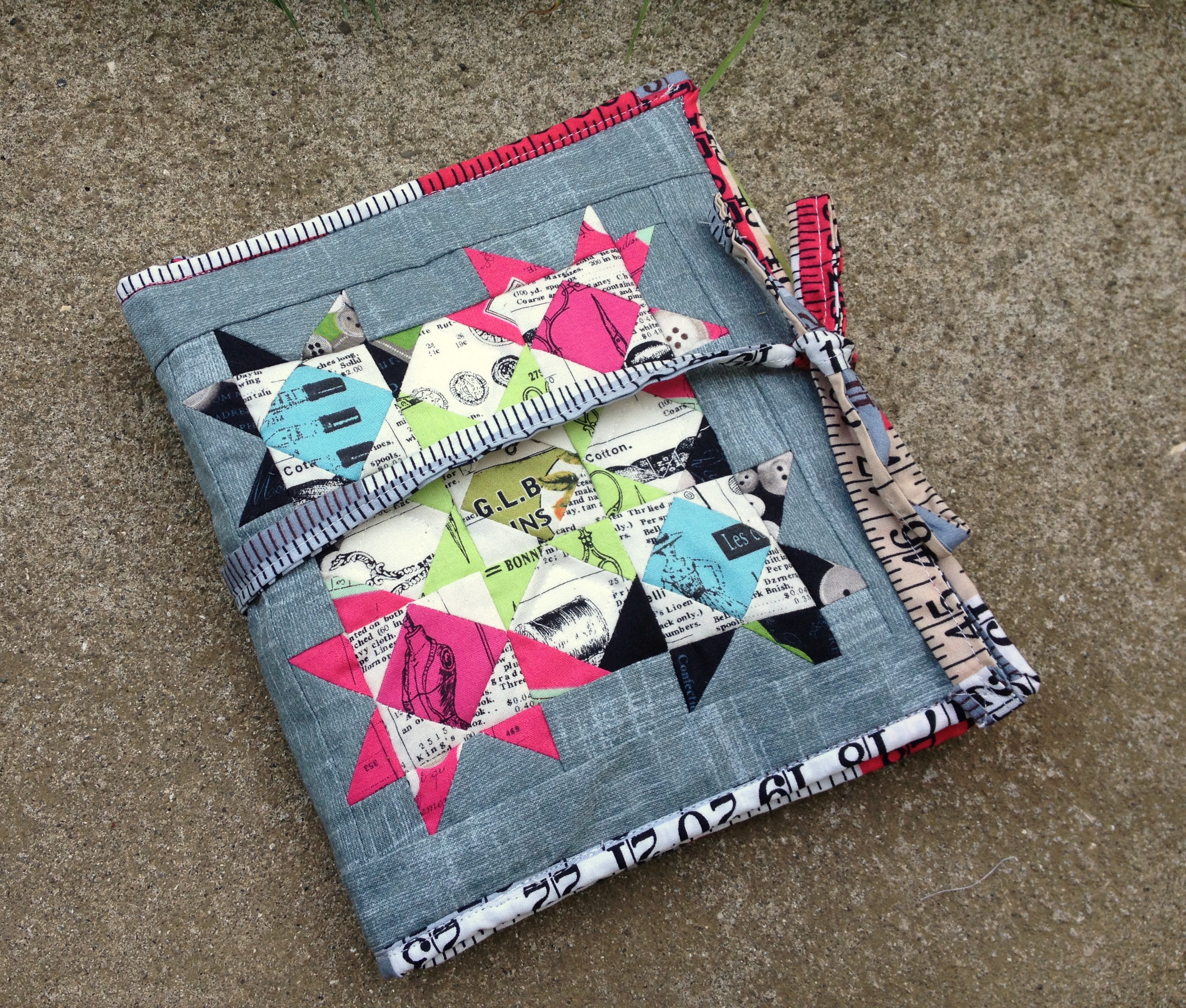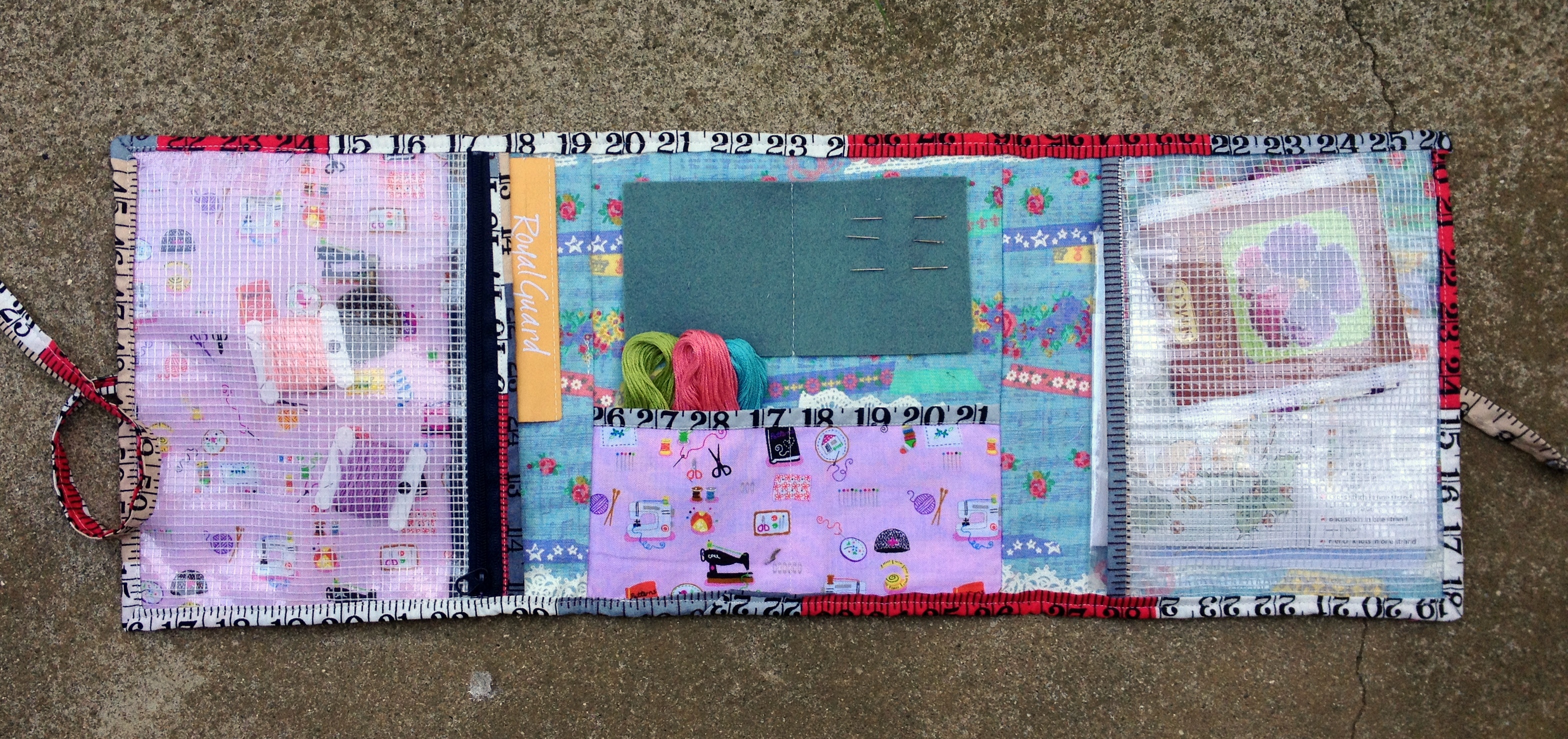 I made a smaller version of the panel from Patchwork, Please! – it’s not perfect as mini piecing and I do not work well together, but nevertheless I used it. Inside I have 3 “sides” – the two outer sections have different-sized vinyl zippered pockets with pockets behind them too, and the middle section has felt for my needles and three smaller pockets for bits and pieces. To keep it all together, I used the tie-up option like from Amy’s tutorial as I felt that it would be more secure this way having the three sections. Sure it obscures the front a bit, but function before beauty this time! You can find more pictures and info on my blog.