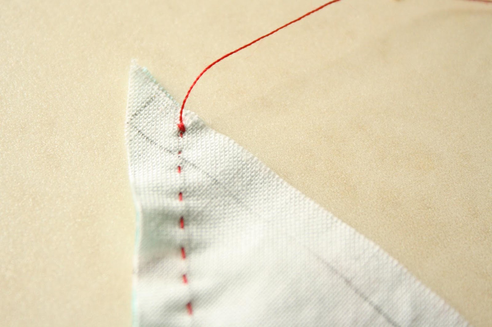 3. Knot one end of your thread, begin sewing with a very small running stitch along drawn line, end your sewing by sewing your last stitch 3 times. This is generally enough for hand piecing.