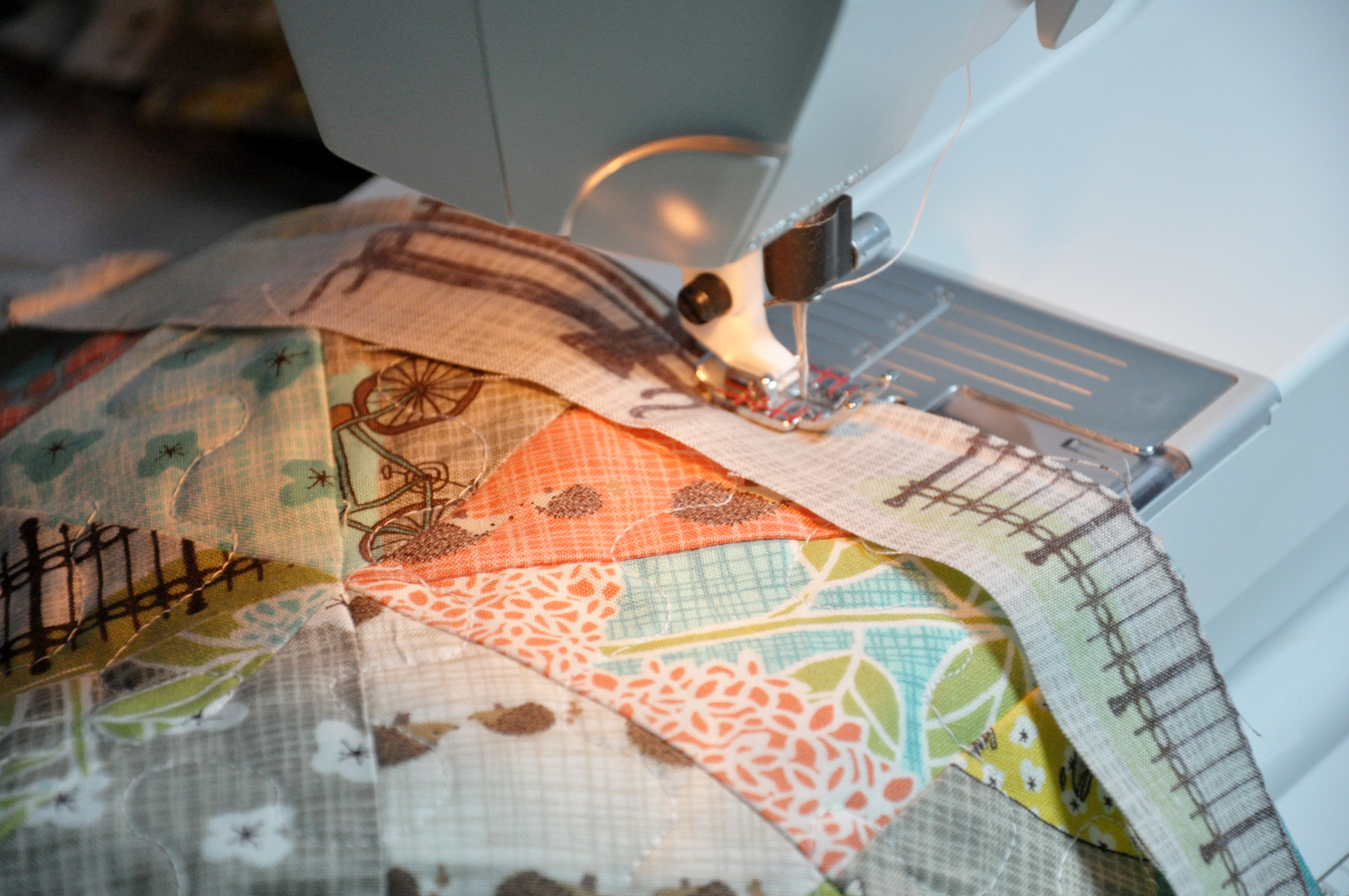 For binding we used 1 1/2″ strips of fabric to make a single fold binding. Measure all four edges of your quilt and add several inches for finishing. Sew it onto the front edge of your quilt, the same as regular binding. Turn toward the back, fold in half and machine sew or hand sew the same as regular binding. If you used batting rather than flannel, cut your binding 2 1/2′ wide so that it will wrap around the thicker quilt sandwich.
