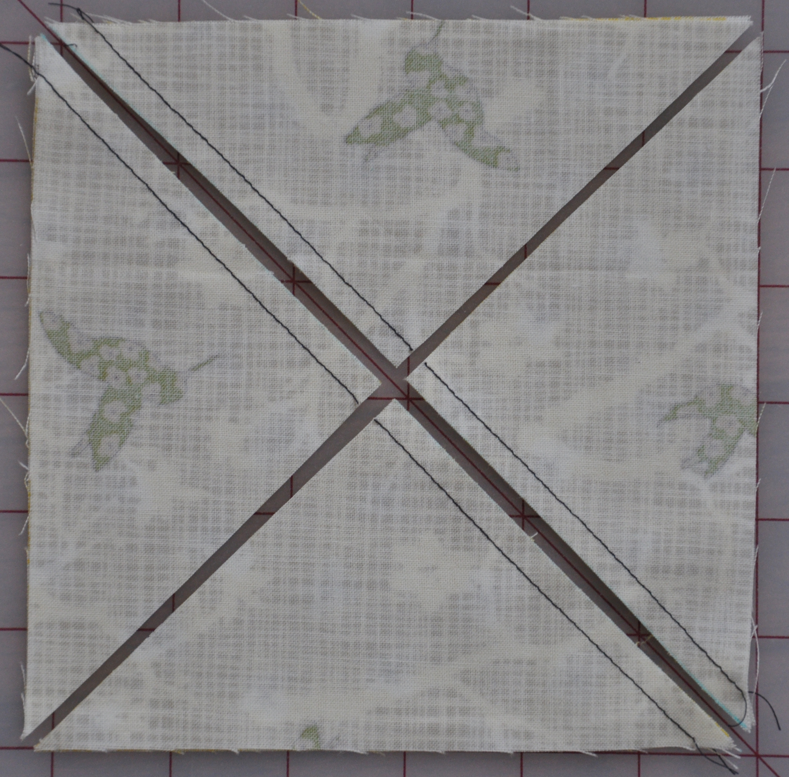 Before moving the blocks, cut from corner to corner on the opposite corners. (The pic. shows the pieces moved, but cut before separating).