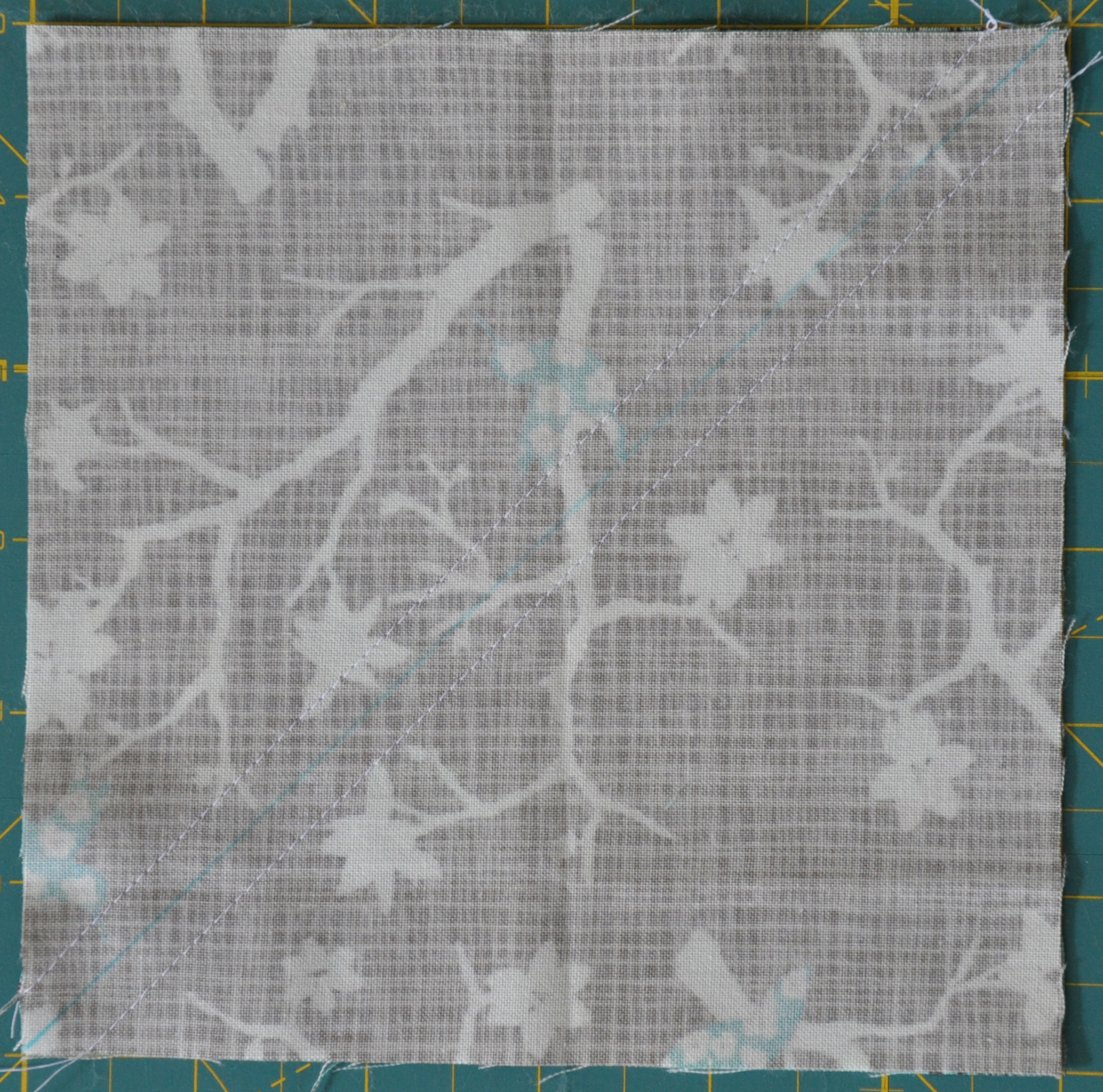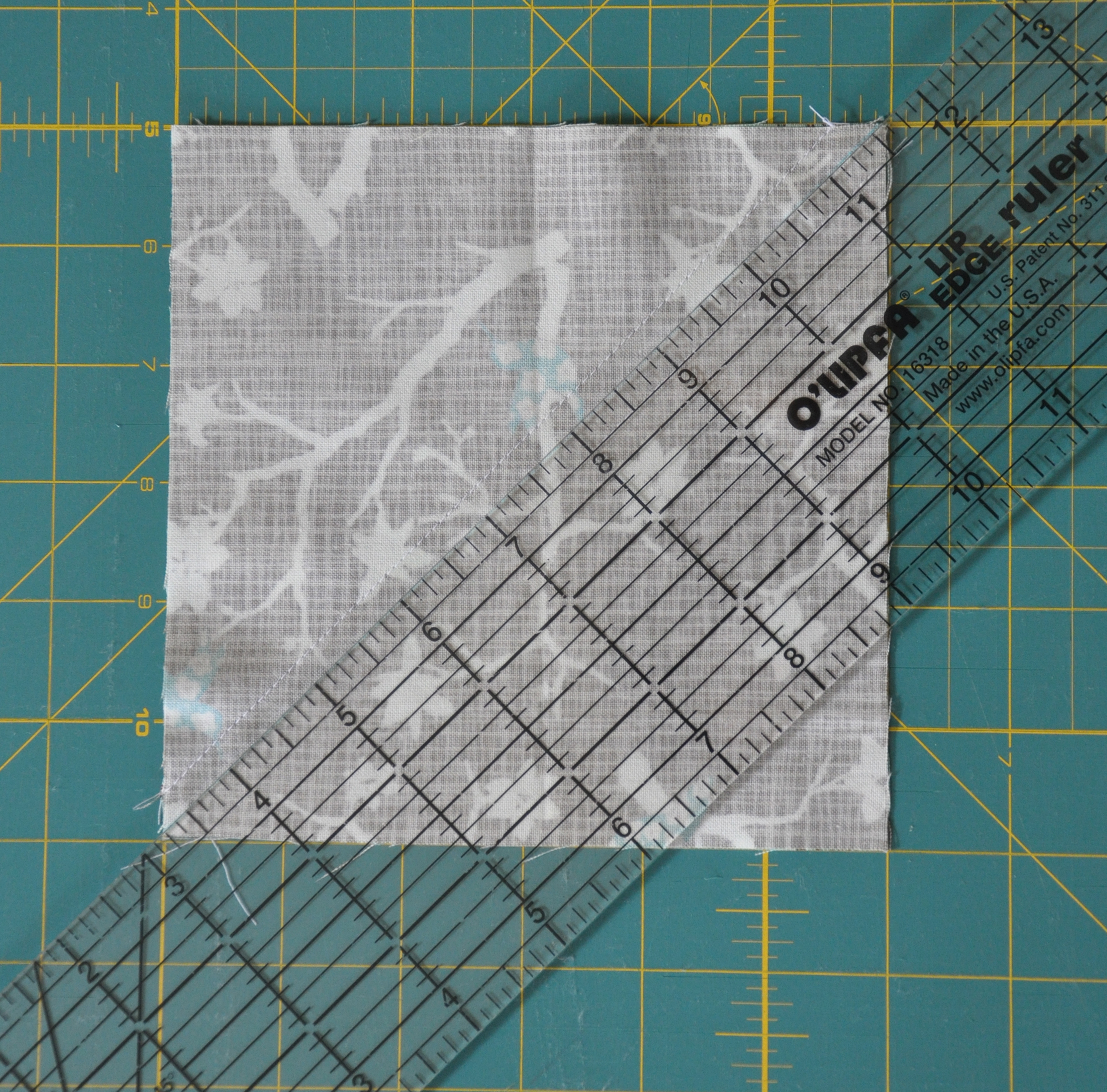 With right sides together draw a line corner to corner and sew a straight line 1/4″ on each side of the line. Do this for all 20 sets.