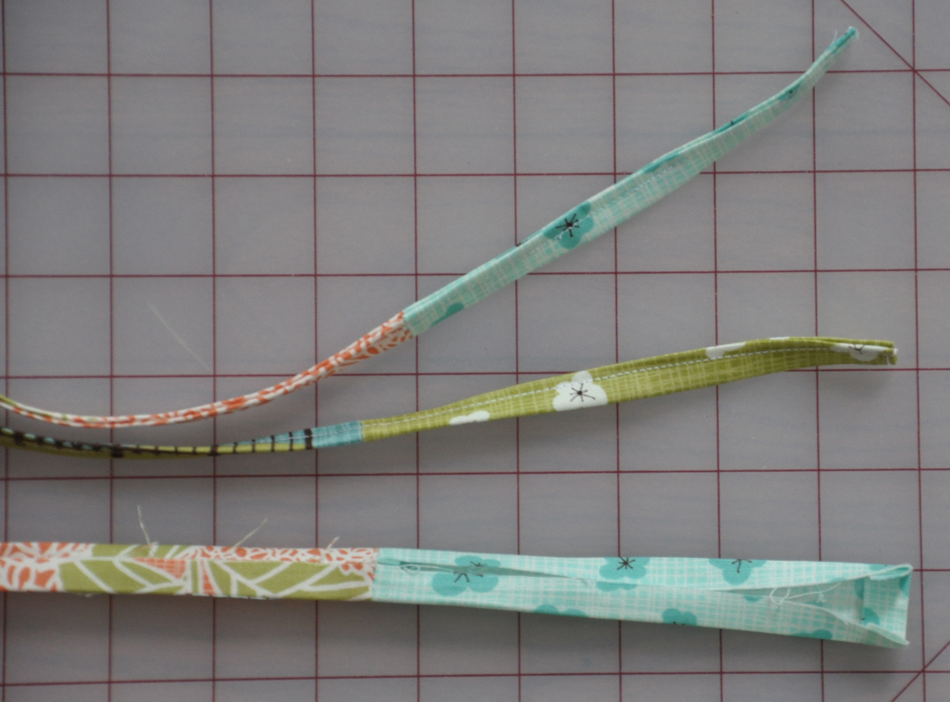 The two ties are approximately 32″ long by 1 1/2″ wide, mine were also pieced from fat eighths. Cut them, iron them in half lengthwise and then fold edges toward center pressing line, the same as making bias tape or binding. Fold the ends of the ties in so they will be finished. Sew along long edges on both ties. These will go on after quilt is bound and quilted.