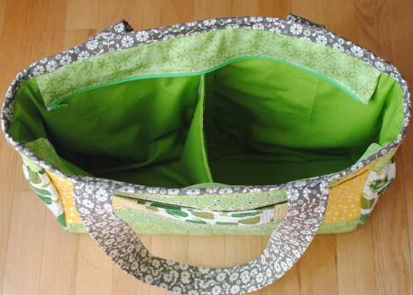 My friend also wanted a divider in her bag, but not the typical lengthwise version. She had originally wanted three compartments, but, by the time the outside of the bag was constructed, the three spaces would have been too small. So, we opted for two, and the divider is actually partially removable {kind of like a camera bag}, so that she can access the whole bag at once, or have it separated out.