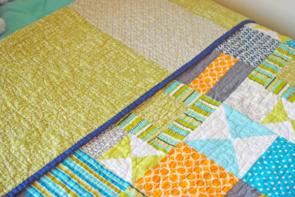 This is also the first quilt I’ve had quilted by a long arm quilter! I sent it to my friend Cindy, who I met through Flickr swaps {I always admired her swap projects!}, and she suggested this traffic quilting pattern. While I originally thought I wanted some simple circles or something, I knew this was the right pattern for the quilt and for my boy!