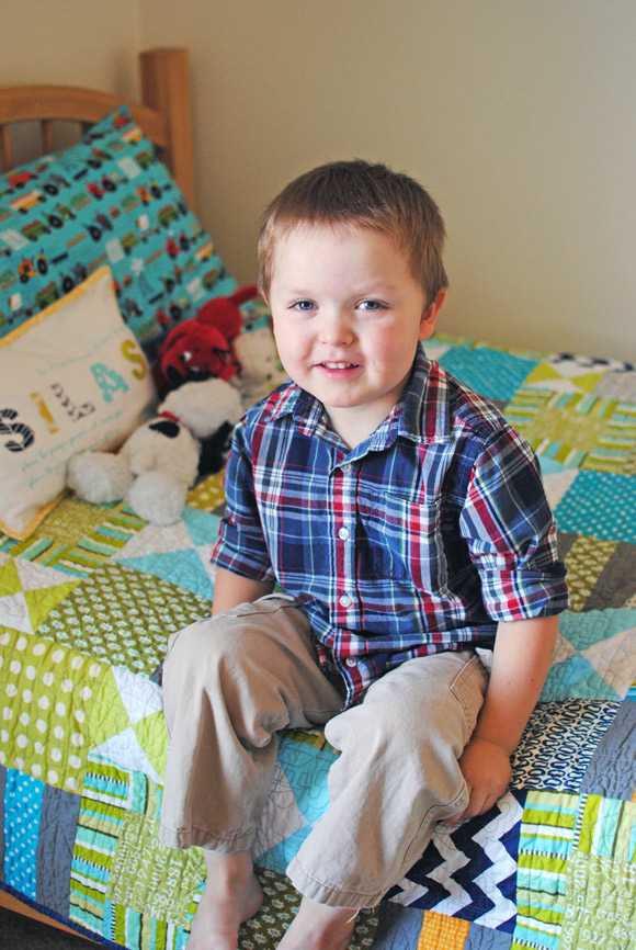 And I think he agrees! Just look at that smile! I was so excited to get it on his bed that I didn’t take any photos before it was washed and crinkled, but he’s been sleeping under it every night. And, it goes perfectly with the pillowcase my mom made him!