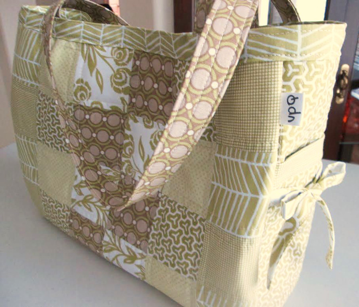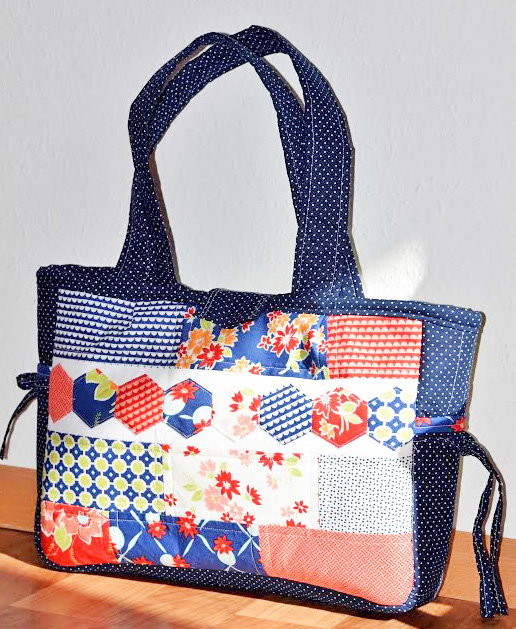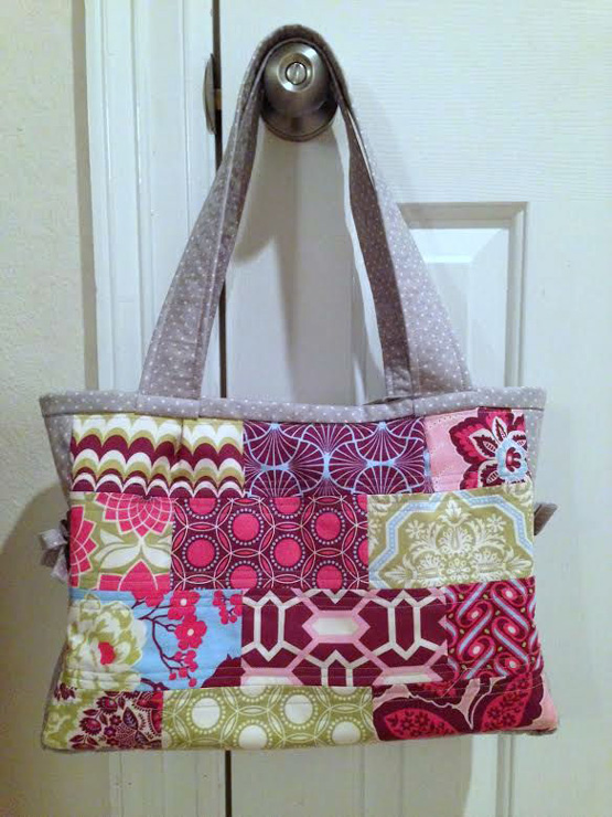 Vicki {vpquilter} used squares instead of tiles, which gives this bag another unique look. The way she alternated the fabrics in the center really give it a focal point.