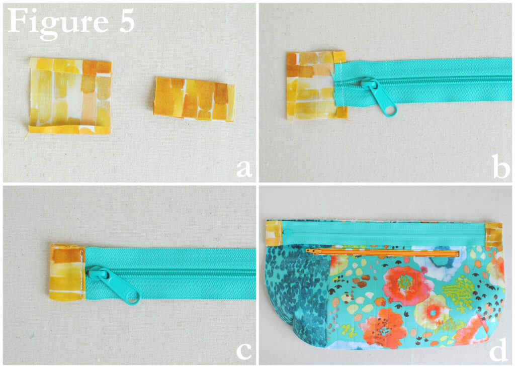 Fold the two zipper tabs in half (1 ¾” x 2”), wrong sides together, press. Then open and fold the short edges ¼” toward the center (Figure 5a). If necessary, trim the zipper to ½” shorter than the width of the top of the clutch (approximately 12 ½”). Place the zipper end so that it extends 3/8” past the fold of the tab, but not all the way to the center (Figure 5b). Sew the tab over the edge of the zipper and trim to zipper width (Figure 5c). Repeat for other zipper end.