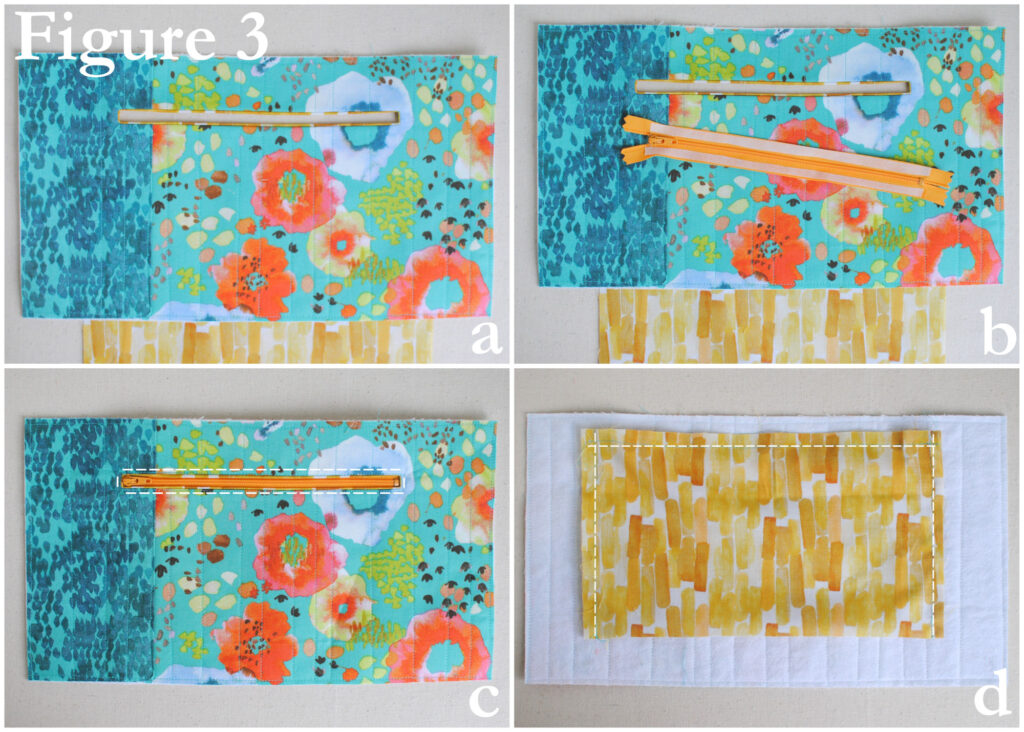 Place the zipper in the opening, and fuse or pin in place. Using a zipper foot, on the front side of the body, sew next to the opening to secure the zipper in place, double stitching the ends (Figure 3c). Turn the body piece over; trim the zipper to width of pocket if necessary. Fold the pocket piece in half and pin. Carefully stitch along the top and sides of pocket, making sure not to stitch through the body (Figure 3d).