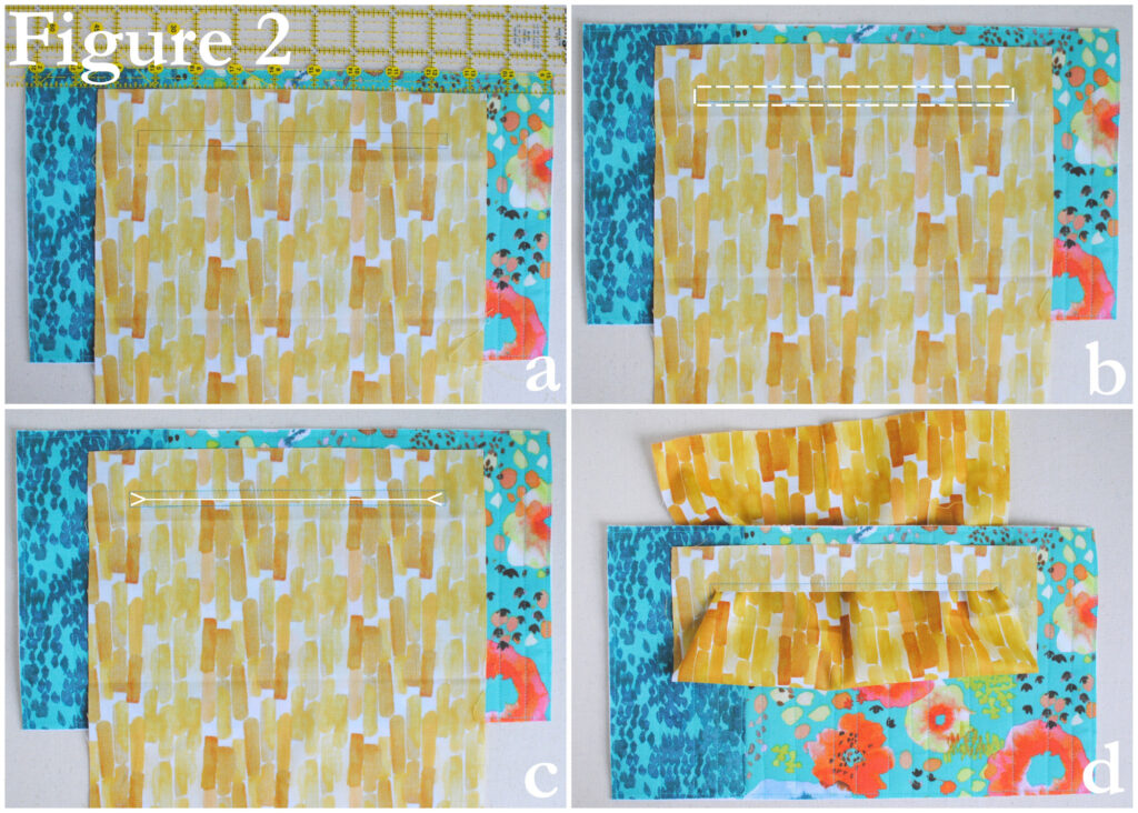 Draw an 8” x 3/8” rectangle on the wrong side of pocket piece 1” below and centered on one 10” edge. Pin pocket piece, RST, 1/2” from the top of the body piece (Figure 2a). Sew around the rectangle through the pocket piece and the body (Figure 2b). Cut a straight line ¼” from each short edge of the rectangle and then clip towards the corners (Figure 2c). Push the pocket fabric throughthe opening (Figure 2d). Press thoroughly to create a window for the zipper (Figure 3a). For an added accent, we allowed some of the zipper pocket fabric to show through the window. This allows for easier pressing and gives an added feature.