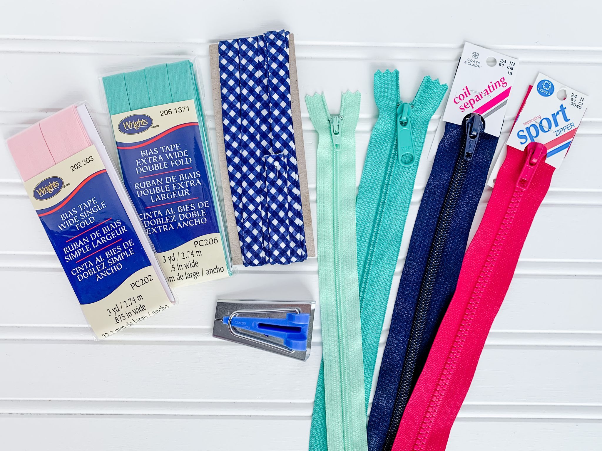 I also stopped by my local, big fabric store and wanted to share the zippers and bias tape I found. If you’re not sure about ordering zippers, either the coil separating jacket zipper or the sport zipper shown above will work just as well. The sport zipper has bigger teeth so you won’t be able to sew over the teeth, but it will still work! Also, if you’re not sure about making your own bias tape, you can purchase pre-made bias tape as well!